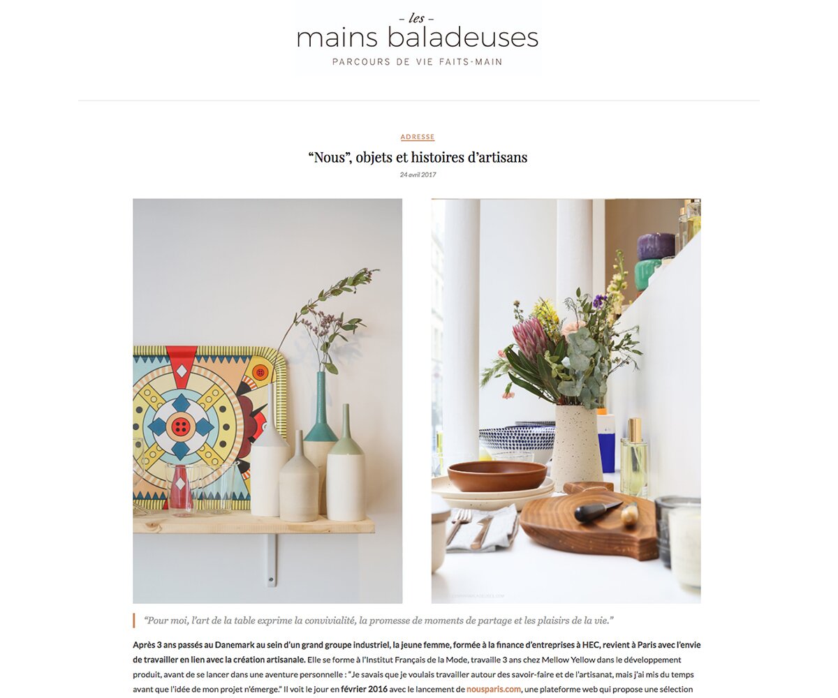« Nous, c’est d’abord l’histoire de Joséphine Ponsolle, ex-financière reconvertie au management de la création à l’IFM (Institut français de la mode). La jeune femme a décidé de célébrer le beau en inaugurant Nous, un écrin minimaliste et accueillant situé dans le 9ème arrondissement parisien. La boutique propose des objets artisanaux dédiés à la maison, à l’art de la table et à la cuisine qui ont tous un point commun, celui d’être I’oeuvre d’un apprentissage, d’une tradition populaire ou d’un savoir-faire unique. La sélection de céramiques, que l’on peut retrouver en ligne vaut particulièrement le détour : les pièces se déclinent dans des teintes et des émaux naturels et terrestres, qui soulignent encore davantage le travail manuel des artistes.
